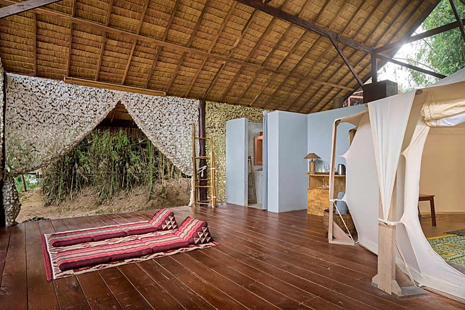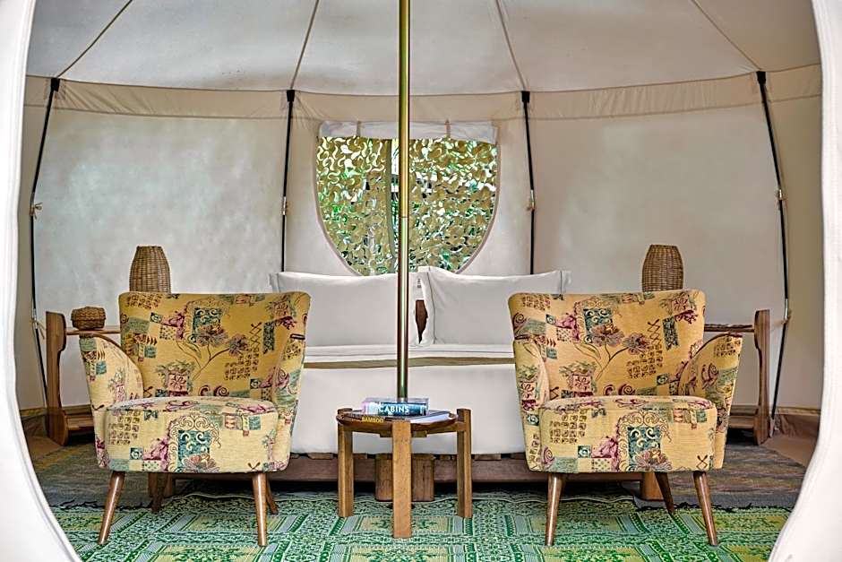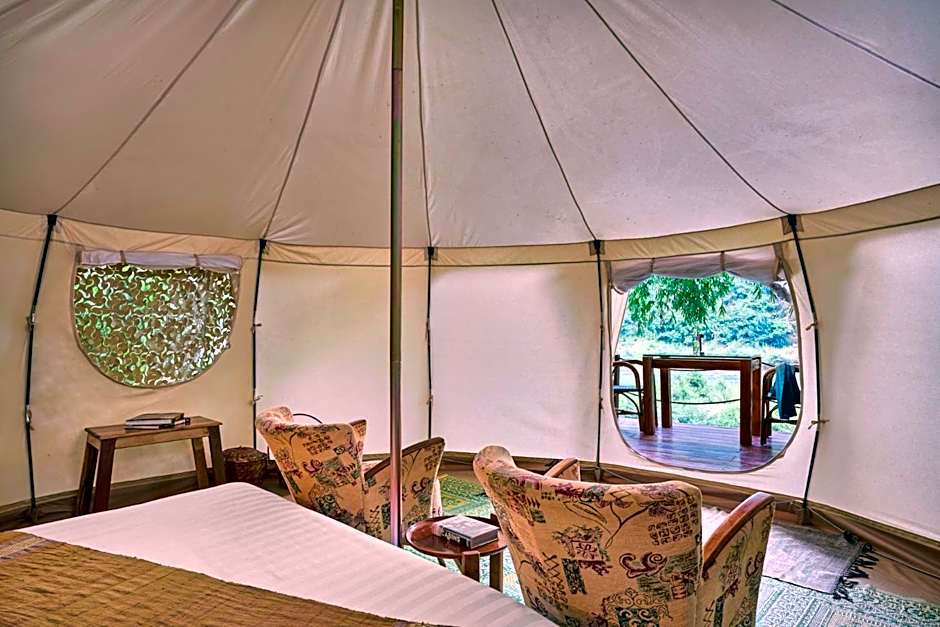 The tent features air conditioning, a private entrance, a terrace with garden views as well as a private bathroom boasting a walk-in shower.